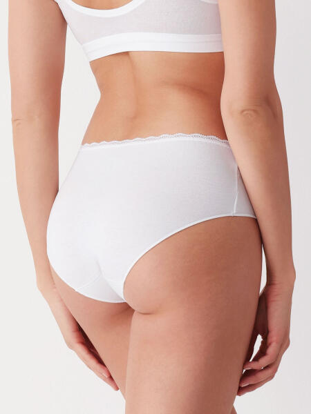 Klasszikus szabású, sima női bugyi Puha pamutból, elasztán hozzáadásával Megerősített vágás Finom csipkével díszített öv A nadrág lapos végei 3 darabos dobozba csomagolva Összetétel: 95% pamut, 5% elasztán