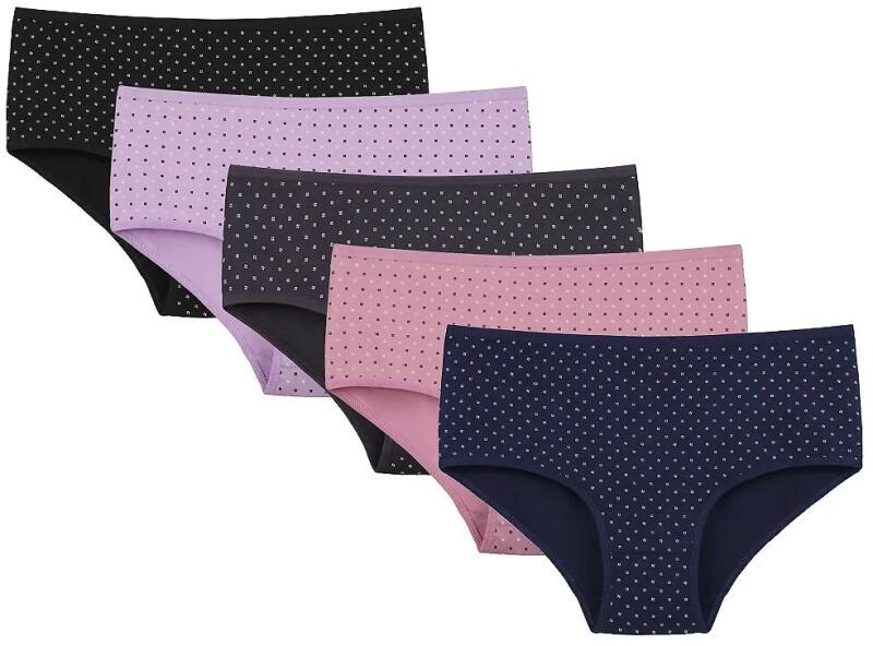 Női bugyik- mintás pamut- teljesen zárt vágás- elérhető színek: rózsaszín, heather, sötétkék, fekete, grafitszürke, lila- párosával csomagolva műanyag zacskóban, különböző kombinációkbanÖsszetétel: 95% pamut, 5% elasztán