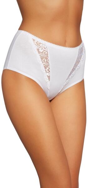 Női bugyi klasszikus szabással. Elülső részét virágmotívumú csipkebetét díszíti. Anyaga: 95% pamut, 5% elasztán