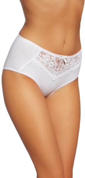 Női bugyi klasszikus szabással. Elülső részét virágmotívumú csipkebetét díszíti. Anyaga: 95% pamut, 5% elasztán