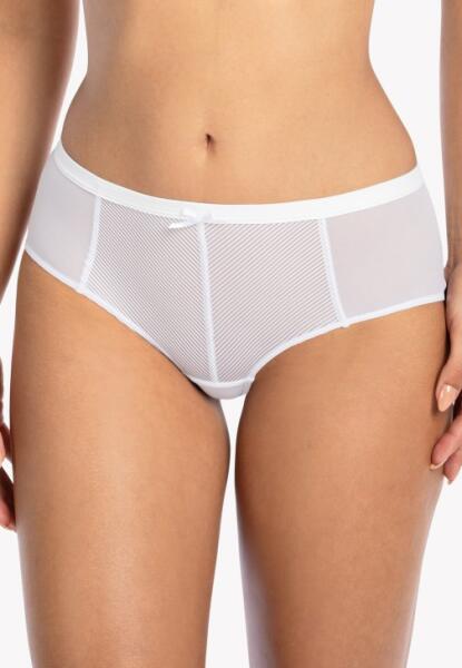 Finom hálóból és bordás anyagból készült női bugyi. Szatén masnival díszített öv. Anyaga: 68% poliamid, 17% elasztán, 10% pamut, 5% poliészter