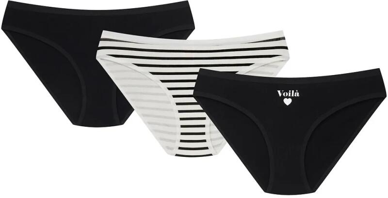 Női pamut bugyi- klasszikus szabású bikini- három darabos dobozban csomagolva, a következő színekben: fekete, fehér és fekete, feketeÖsszetétel: 95% pamut, 5% elasztán