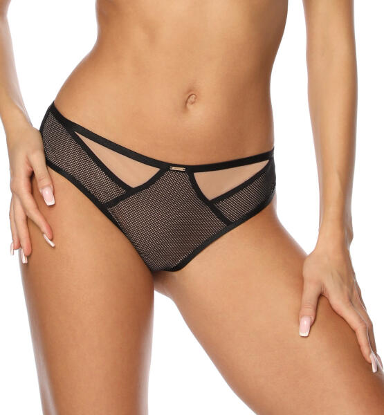 Női bugyi Bézs és fekete háló Fényes varratok Dupla tüll hátlapja, lapos kivitelben Szemet gyönyörködtető kivágás a felső vonalon Összetétel: 70% poliamid, 16% pamut, 14% elasztán