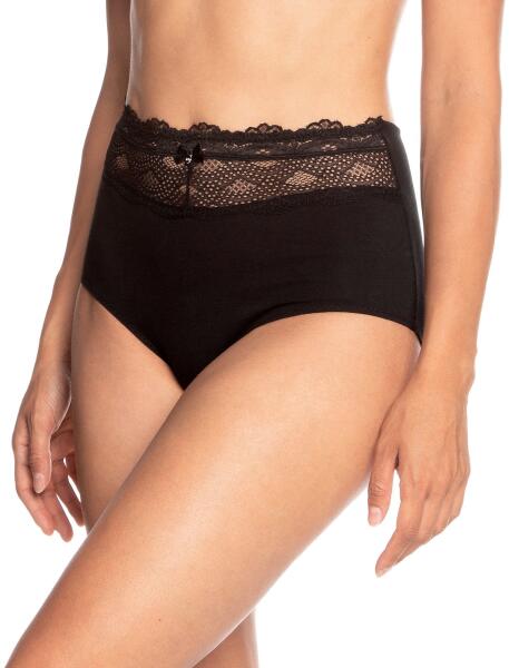 Bugyi puha pamutból, magas derékvonallal. Elöl rendezett csipke, felső derékvonalon szatén masni medállal. Anyaga: 95% pamut, 5% elasztán