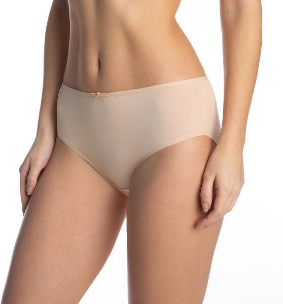 Natúr pamutból készült női bugyi, lapos elasztikus derékpánttal és masnival, oldalt gyűrötten. Három darabba csomagolva. Anyaga: 95% pamut, 5% elasztán