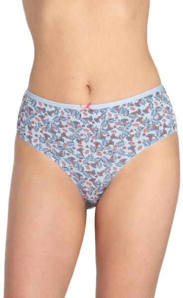 Női pamut bugyi- klasszikus szabású- lapos, rugalmas derékpánt masnival- enyhén felhúzott csípő- három darab műanyag zacskóba csomagolva, sötétkék, égkék és púderrózsaszín színbenÖsszetétel: 95% pamut, 5% elasztán