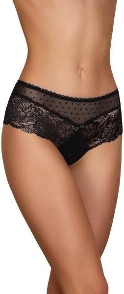 Finom hálóból készült női bugyi apró pöttyökkel, csipkével virágmotívummal. Sima mikroszálas hátlap, lézeres vágás. Anyaga: 85% poliamid, 15% elasztán