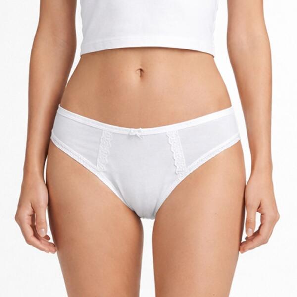 Fedezd fel ezt a fehér pamut bikini fazonú női bugyit, csipkével díszítve, amely egyszerre biztosít kényelmet és letisztult nőies megjelenést! A klasszikus fazonú alsó 100% pamut anyagból készült, így légáteresztő és bőrbarát viseletet nyújt a mindennapokra. A finom csipke részletek elegáns hangsúlyt adnak a praktikus ruhadarabnak, miközben megtartják a klasszikus, egyszerű stílust.