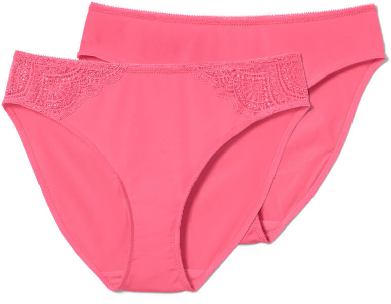 2 db női alsó, rózsaszín Szín: Rózsaszín Anyag: 91% poliamid, 9% elasztán Csipke: 83% poliamid, 17% elasztán Puha microtouch anyag1x finom csipkével, 1x csipke nélkül Tartós és mosásálló, kiváló minőségű márkás elasztánnalPamut lépésbetét