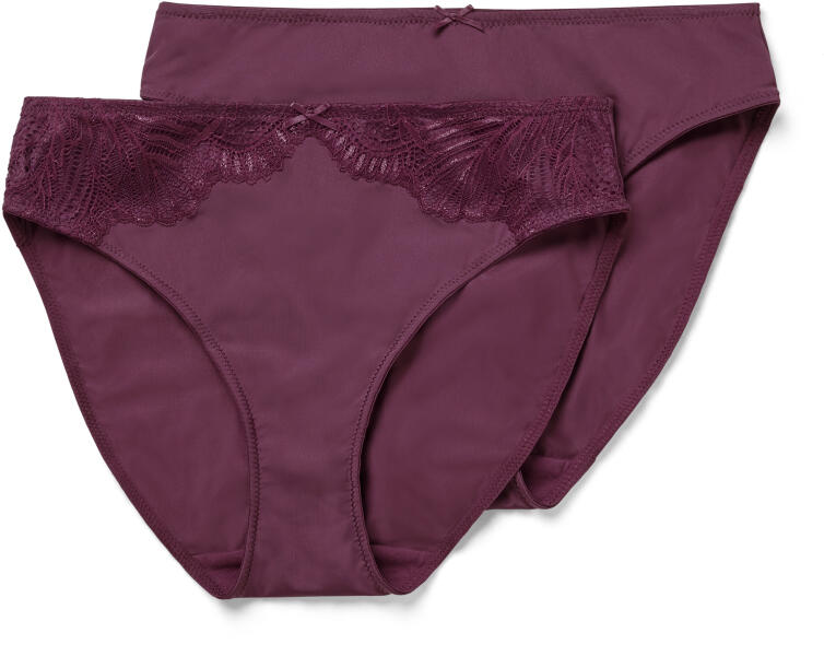 2 db női alsó, microtouch, csipkés, burgundi Szín: 2x burgundi Anyag: 91% poliamid, 9% elasztán Csipke: 83% poliamid, 17% elasztán Puha microtouch anyag1x finom csipkével, 1x csipke nélkülTartós és mosásálló, kiváló minőségű márkás elasztánnalPamut lépésbetét