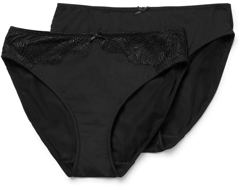 2 db női alsó, microtouch, csipkés, fekete Szín: 2x fekete Anyag: 91% poliamid, 9% elasztán Csipke: 83% poliamid, 17% elasztán Puha microtouch anyag1x finom csipkével, 1x csipke nélkülTartós és mosásálló, kiváló minőségű márkás elasztánnalPamut lépésbetét
