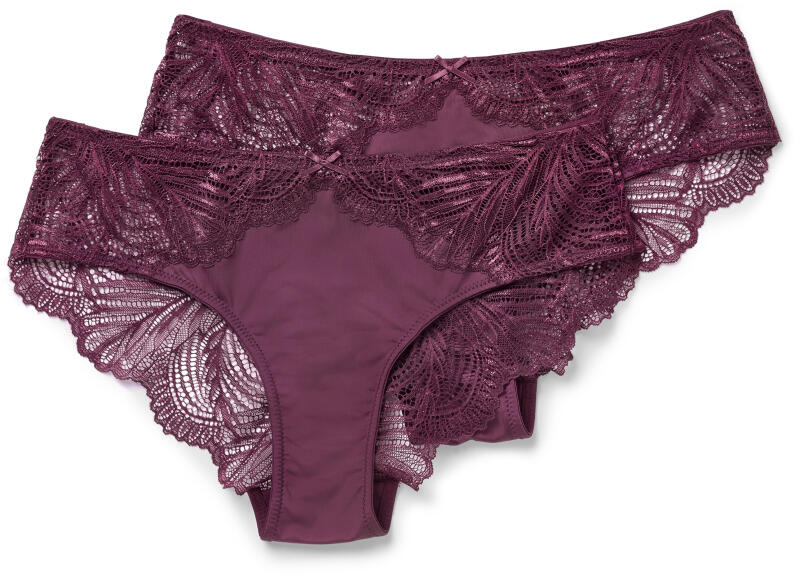 2 db női brazil alsó, csipkés, burgundi Szín: 2x bordópiros Anyag: 91% poliamid, 9% elasztán Csipke: 83% poliamid, 17% elasztán Puha microtouch anyagHátul és oldalt finom csipkévelTartós és rendkívül mosásálló, kiváló minőségű, márkás elasztánnalPamut lépésbetét