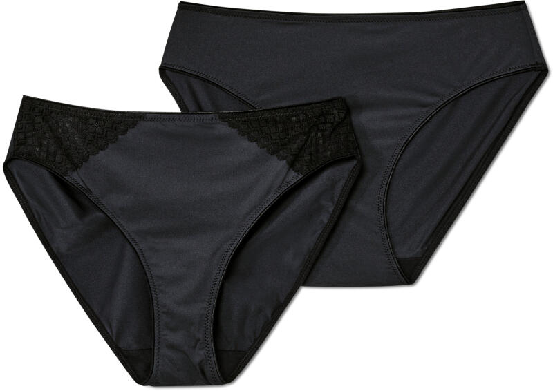 2 női alsó Szín: Fekete Anyag: 83% poliamid, 17% elasztán Csipke: 89% poliamid, 11% elasztán Puha microtouch anyag1x finom csipkével, 1x csipke nélkülKiváló minőségű márkás elasztánnal, a tartósság és a mosásállóság érdekébenPamut lépésbetéttel