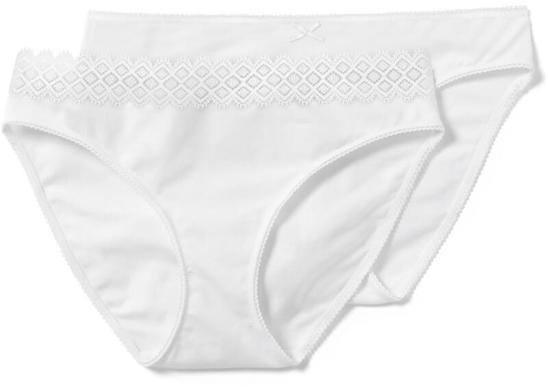 2 női alsó, fehér Szín: 2x fehér Anyag: 93% pamut (ökológiai gazdálkodásból származó), 7% elasztán Csipke: 93% poliamid, 7% elasztán Kellemesen puha pamut-sztreccs anyag1x finom csipkével a derékpánton, 1x csipke nélkülTartós és rendkívül mosásálló, kiváló minőségű, márkás elasztánnalPamut lépésbetétBiopamuttalEzek az alsók kímélik a vízkészleteket.