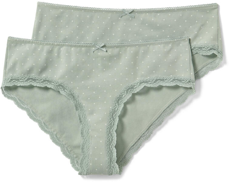 2 női hipster alsó Szín: Zsályazöld, fehér pöttyös Anyag: 90% pamut (ökológiai gazdálkodásból származó), 10% elasztán Csipke: 93% poliamid, 7% elasztán Kellemesen puha pamut-sztreccs anyagFinom csipkével a lábkivágásnálKiváló minőségű márkás elasztánnal, a tartósság és a mosásállóság érdekébenPamut lépésbetétBiopamuttalEzek a hipster alsók védik a vízkészleteket.