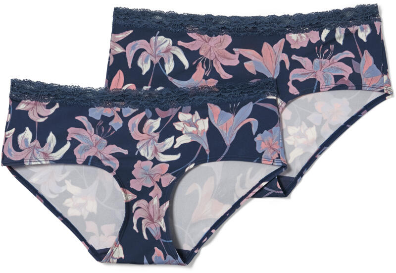 2 női magas derekú alsó, kék virágokkal Szín: Kék nyomott virágmintával Anyag: 83% poliamid, 17% elasztán Csipke: 90% poliamid, 10% elasztán Puha microtouch anyagFinom csipkévelTartós és a mosást rendkívül jól tűrő, kiváló minőségű, márkás elasztánnalPamut lépésbetét