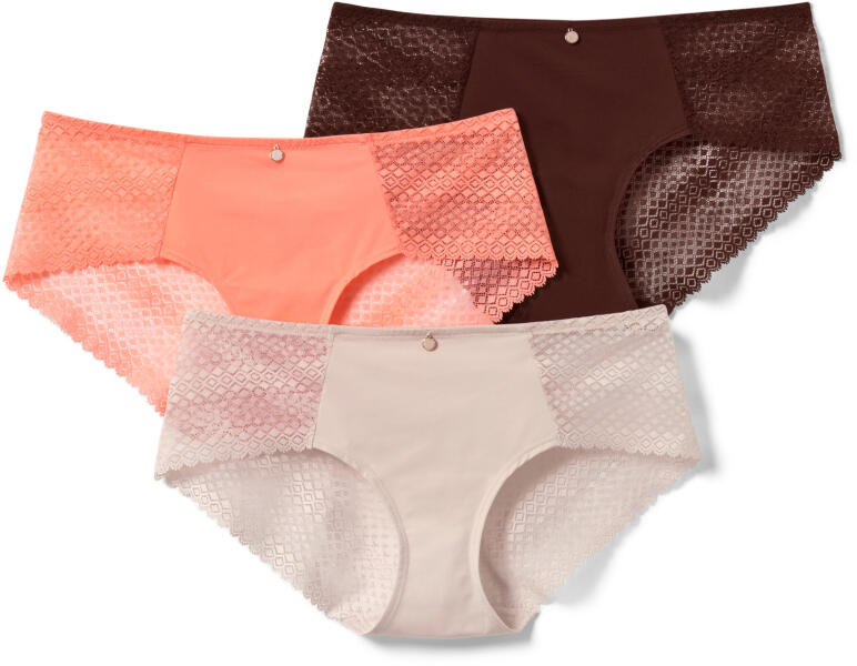 3 alsó Szín: 1x barna, 1x krémszínű, 1x papaja Anyag: 91% poliamid, 9% elasztán Csipke: 89% poliamid, 11% elasztán Női alsók puha microtouch anyagbólHátul és oldalt finom csipkebetéttelMutatós fémlemezkévelTartós és rendkívül mosásálló, kiváló minőségű, márkás elasztánnalPamut lépésbetét