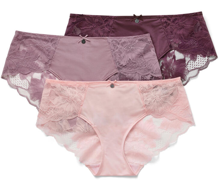 3 db női alsó Szín: 1x rózsaszín, 1x mályva, 1x padlizsán Anyag: 79% poliamid, 21% elasztán Csipke: 84% poliamid, 16% elasztán Puha microtouch anyagOldalt és hátul finom csipkebetoldásMutatós fémlemezkeTartós és rendkívül mosásálló, kiváló minőségű márkás elasztánnalPamut lépésbetét