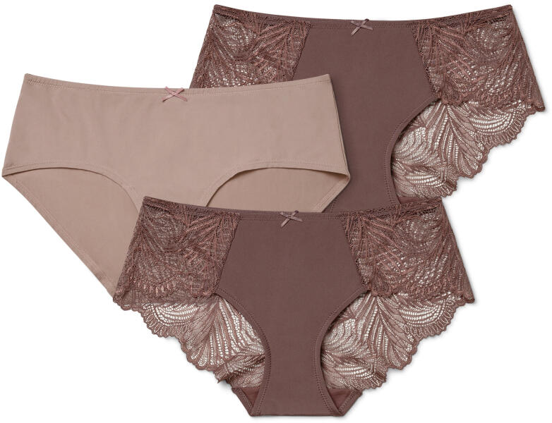3 db női magasderekú alsó, csipkés, nugát/bézs Szín: 2x mogyoróbarna, 1x bézs Anyag: 91% poliamid, 9% elasztán Csipke: 83% poliamid, 17% elasztán Puha microtouch anyag2x finom csipkebetéttel hátul és oldaltTartós és rendkívül mosásálló, kiváló minőségű márkás elasztánnalPamut lépésbetét