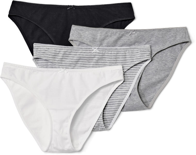 4 női alsó, szürke/fehér/fekete Szín: 1x fehér, 1x melírozott szürke, 1x fekete, 1x melírozott szürke-fehér csíkos Anyag: 95% pamut (támogatja a Cotton made in Africa kezdeményezést), 5% elasztán Kellemesen puha pamut-sztreccs anyagRugalmas díszszegély a derékrészenKiváló minőségű márkás elasztánnal, a tartósság és a mosásállóság érdekébenPamut lépésbetétEzek az alsók támogatják a termelőket.