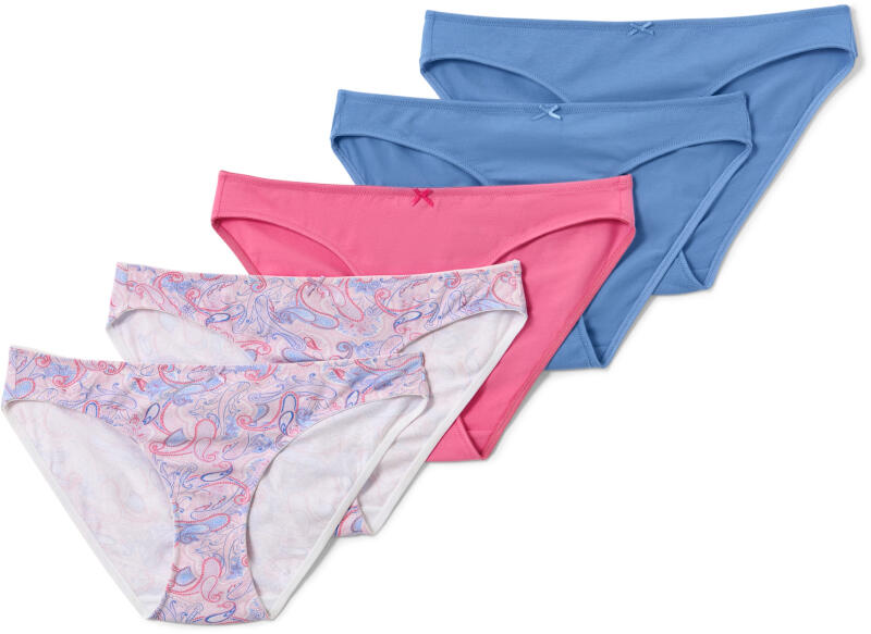 5 db női alsó, mintás/rózsaszín/világoskék Szín: 2x világoskék, 2x paisley-mintás, 1x rózsaszín Anyag: 95% pamut, 5% elasztán Női alsóneműk kellemesen puha pamut-sztreccs anyagbólTartós és rendkívül mosásálló, kiváló minőségű, márkás elasztánnalPamut lépésbetétTartós pamuttalGOTS organic – konverziós anyagokból, CU 809415 tanúsítottEzek az alsók elősegítik a fenntartható gyapottermesztést.