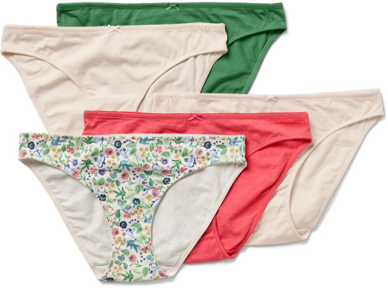 5 db női alsó, virágos/krém/korall/zöld Szín: 2x krémszínű, 1x korallpiros, 1x zöld, 1x krémszínű nyomott mintával Anyag: 95% pamut (támogatja a Cotton made in Africa kezdeményezést), 5% elasztán Puha pamut-sztreccs anyagTartós és a mosást rendkívül jól tűrő, kiváló minőségű, márkás elasztánnalPamut lépésbetétEzek az alsók támogatják a termelőket.