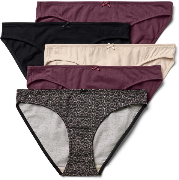 5 db női alsó, mintás/burgundi/fekete/krém Szín: 2x bordópiros, 1x fekete, 1x krémszínű, 1x nyomott mintás Anyag: 95% pamut, 5% elasztán Női alsónadrágok kellemesen puha pamut-sztreccs anyagbólTartós és rendkívül mosásálló, kiváló minőségű márkás elasztánnalPamut lépésbetétGOTS organic – konverziós anyagokból, CU 809415 tanúsítottEzek az alsók elősegítik a fenntartható gyapottermesztést.