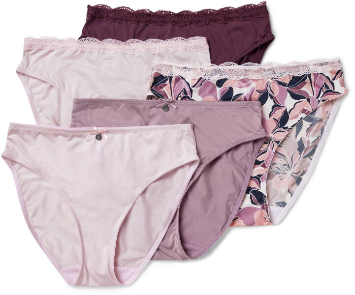 5 db női alsó, csipkés, mintás/rózsaszín/mályva Szín: 1x padlizsánlila, 1x mályva, 2x rózsaszín, 1x nyomott virágmintás Anyag: 79% poliamid, 21% elasztán Csipke: 84% poliamid, 16% elasztán Puha microtouch anyag3x puha csipkével a derékpánton2x Szaténmasnival és mutatós fémlemezkévelTartós és rendkívül mosásálló, kiváló minőségű márkás elasztánnalPamut lépésbetét