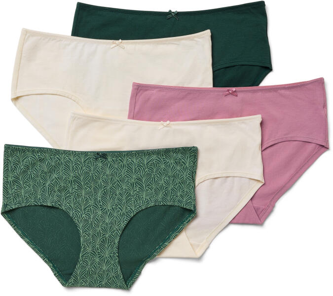 5 női alsó Szín: 2x krémszínű, 1x sötétzöld, 1x fáradtrózsaszín, 1x sötétzöld teljes felületén nyomott mintával Anyag: 95% pamut, 5% elasztán Női alsók kellemesen puha pamut-sztreccs anyagbólTartós és rendkívül mosásálló, kiváló minőségű márkás elasztánnalPamut lépésbetétGOTS organic – konverziós anyagokból, CU 809415 tanúsítottEzek az alsók elősegítik a fenntartható gyapottermesztést.