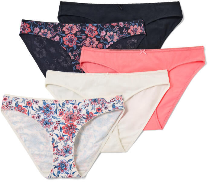 5 női alsó, virág/krém/papaya/sötétkék Szín: 1x krémszínű nyomott virágmintával, 1x papaja, 1x krémszínű, 1x sötétkék, 1x sötétkék, nyomott virágmintával Anyag: 95% pamut, 5% elasztán Kellemesen puha pamut-sztreccs anyagA kiváló minőségű márkás elasztán tartóssá és mosásállóvá tesziPamut lépésbetétTartós pamuttalGOTS organic – konverziós anyagokból, CU 809415 tanúsítottEzek az alsók elősegítik a fenntartható gyapottermesztést.