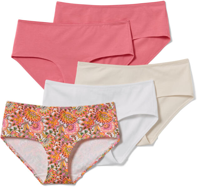 5 női alsó Szín: 2x pink, 1x fehér, 1x krémszínű, 1x színes, nyomott virágmintával Anyag: 95% pamut (támogatja a Cotton made in Africa kezdeményezést), 5% elasztán Női alsó kellemesen puha pamut-sztreccs anyagbólTartós és a mosást rendkívül jól tűrő, kiváló minőségű, márkás elasztánnalPamut lépésbetétEzek az alsók támogatják a termelőket.