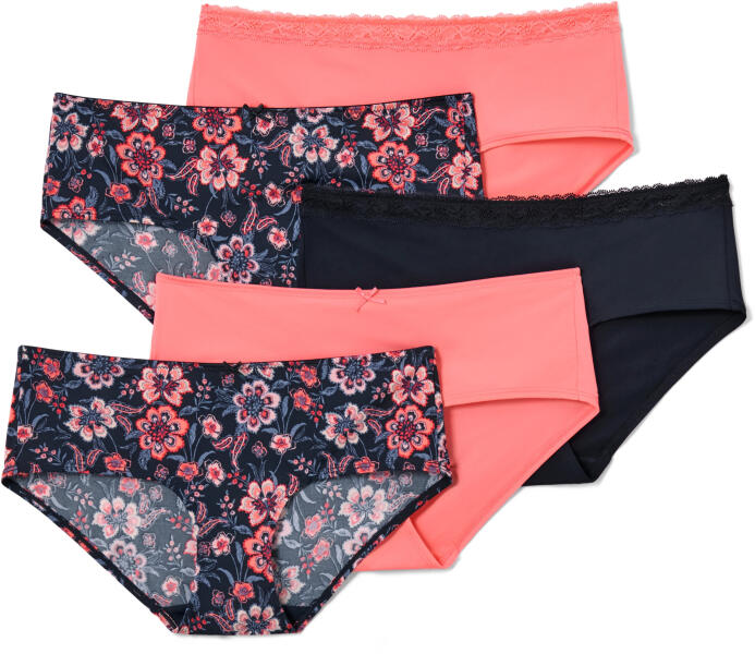 5 női magas derekú alsó, microtouch, virágos, sötétkék Szín: 2x papaja, 1x sötétkék, 2x sötétkék, nyomott virágmintás Anyag: 91% poliamid, 9% elasztán Csipke: 92% poliamid, 8% elasztán Puha microtouch anyag2x finom csipkével a derékpánton, 3x csipke nélkülKiváló minőségű márkás elasztánnal, tartós és rendkívül mosásállóPamut lépésbetét