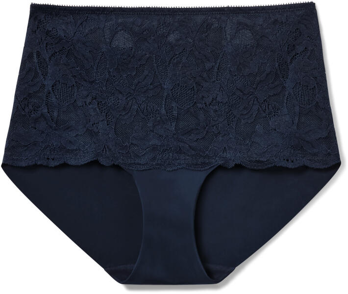 Női magas derekú alsó, kék Szín: Sötétkék Anyag: 74% poliamid, 26% elasztán Csipke: 91% poliamid, 9% elasztán Bélés: 85% poliamid, 15% elasztán A has területén enyhén alakformáló anyag finom csipkerátéttelMagas szabású derékrésszel az enyhén alakformáló hatásértFinom csipkévelPuha Microtouch anyagKiváló minőségű márkás elasztánnal, a tartósság és a mosásállóság érdekébenPamut lépésbetét