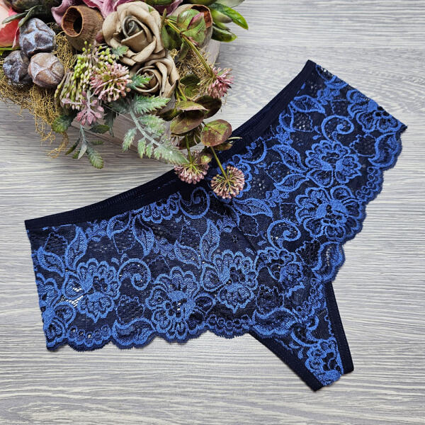 Ízléses, finom csipke, széles oldalú tanga. Intim résznél pamut berakással.