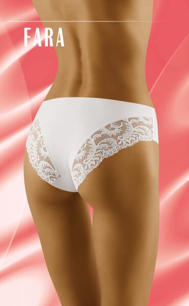 Sima mikroszálas női bugyi. A dereka és az elülső nadrág lézervágású, hátul áttört csipkével díszített. Anyaga: 83% poliamid, 17% elasztán